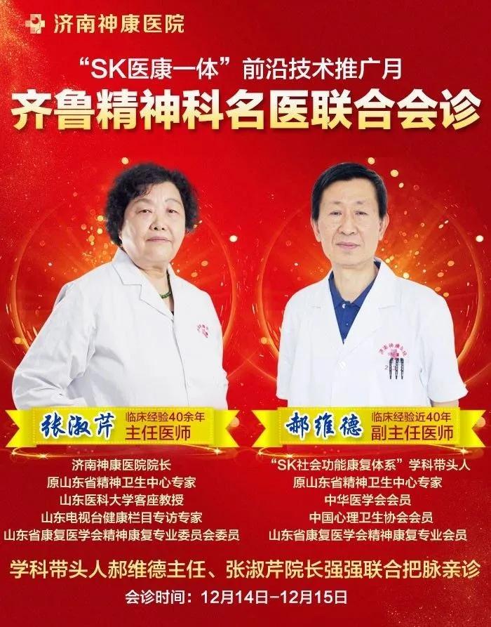 为了帮助更多病友解决精神疾病的困扰,让饱受顽固失眠、抑郁症、焦虑症、精神障碍、精神分裂症等疑难精神疾病患者早日重获健康新生,济南神康医院12月14日—15日持续开展服务民生,助力精神健康的会诊活动,届时,张淑芹院长、郝维德主任与省内知名精神科专家将再度联袂为老百姓提供优质、安全、高效的诊疗服务。会诊期间,就诊患者可免费体验中医特色针灸——针灸,并可享脑功能检查半价,让患者享受到实实在在的优惠,少花钱治好病。相信本次会诊将为我省更多的疑难精神心理疾病患者摆脱疾病困扰,开启幸福曙光!